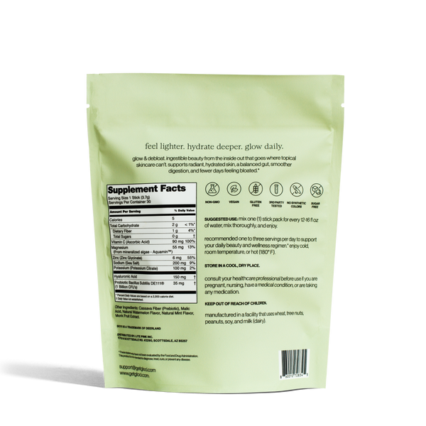 The glow-giving electrolyte—supports hydration and balance for both skin + gut health.